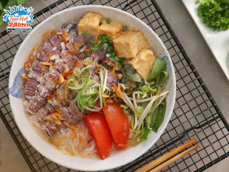 Bun Be Be is a noodle dish featuring mantis shrimp, a type of crustacean with sweet and firm meat. The noodles are served in a flavorful broth with mantis shrimp, vegetables, and herbs. Bun Be Be is a popular seafood dish in Quang Ninh.