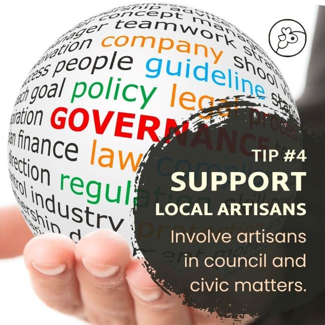 Close up of a hand holding a glass ball with words relating to social and government elements. Text: Tip 4 Involve artisans in council and civic matters,