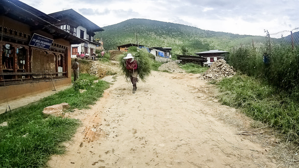 Alt text: A Bhutanese farmer carrying his harvest embodies the serene way of life and demonstrates the deep bond between the people and the land.