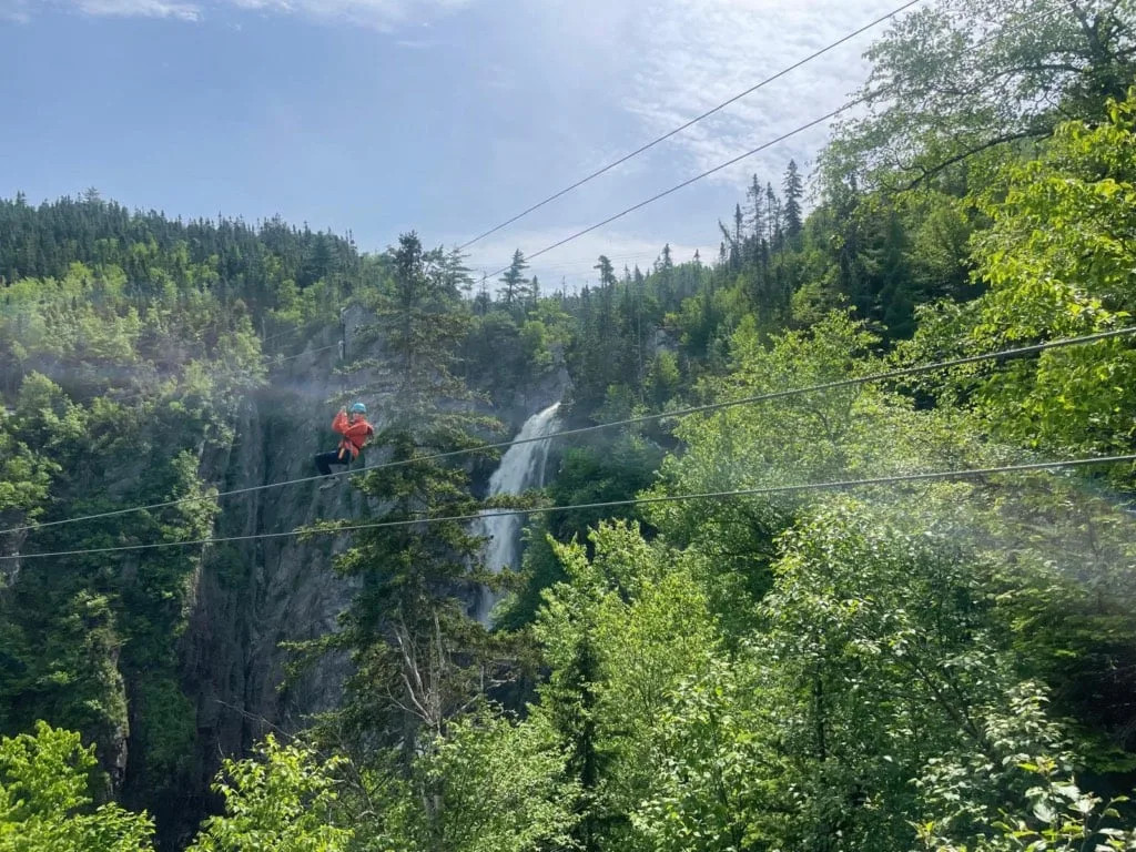 A woman rides a zipline in front of Steady Brook Falls at Marble Mountain in Newfoundland