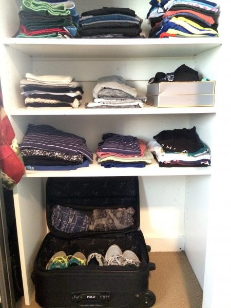 If you have floor space in your closet, use your suitcase as a shoe rack. Lay the suitcase flat and open, with the open side facing you, and store your shoes in neat rows. Protect the inside of your suitcase with a towel or cloth to prevent dirt and grime.