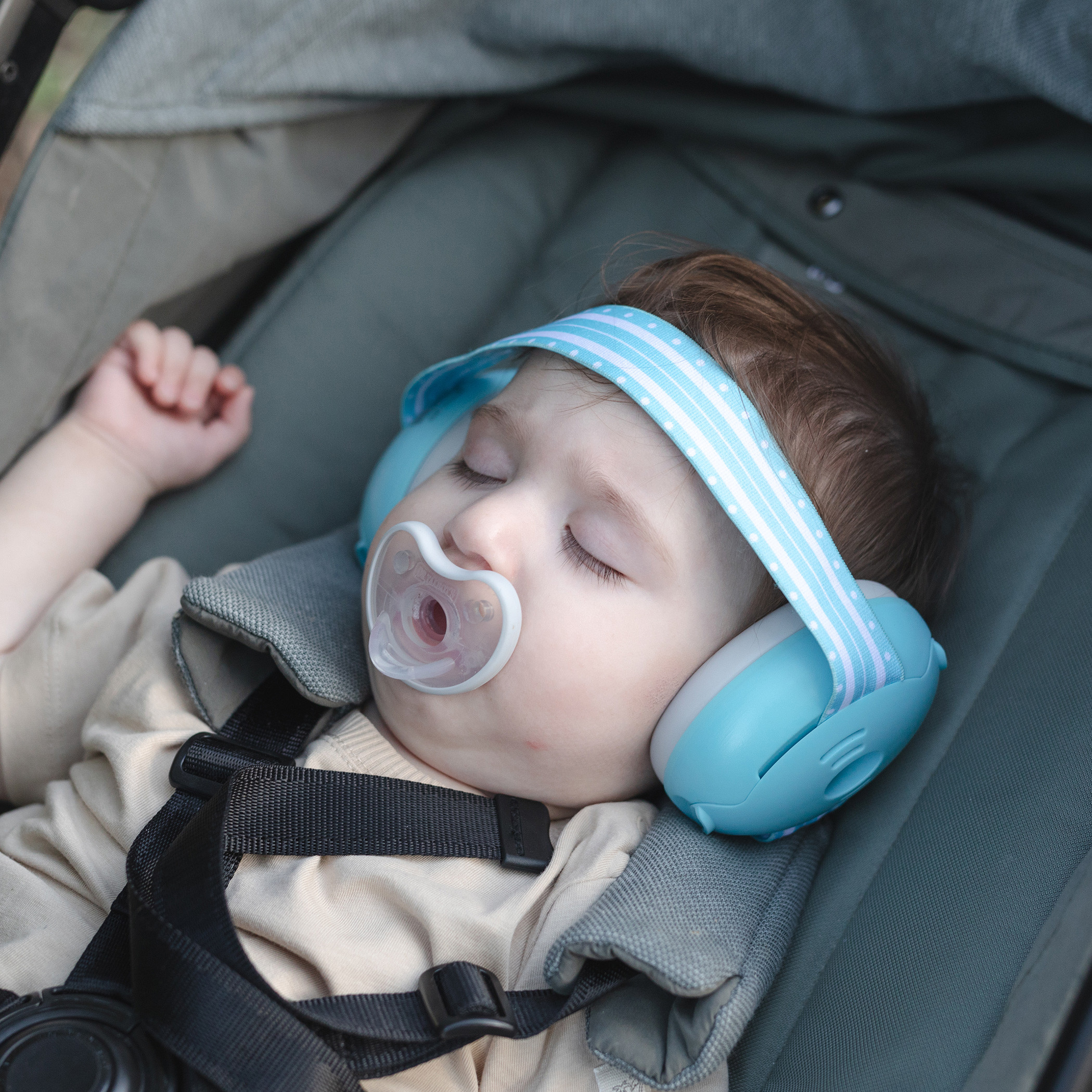 Sleeping baby with pacifier wearing Nuby Soft Sounds Baby Earmuffs.