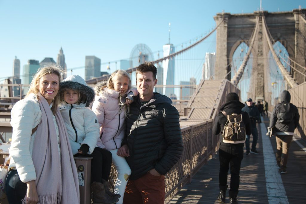 family posing for camera on brooklyn bridge