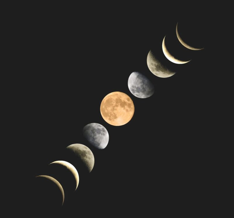 Phases of the moon, from new to full to new again lined up in a diagonal row. The full moon is orange. The rest are grey.